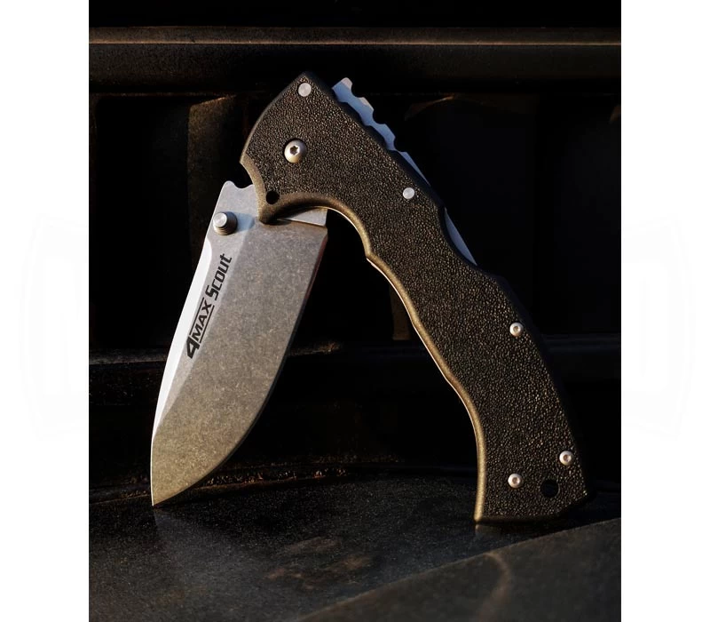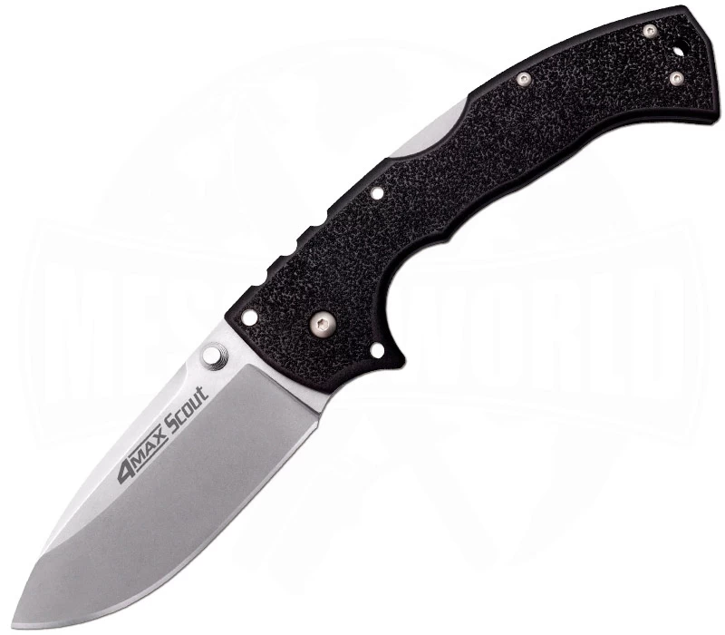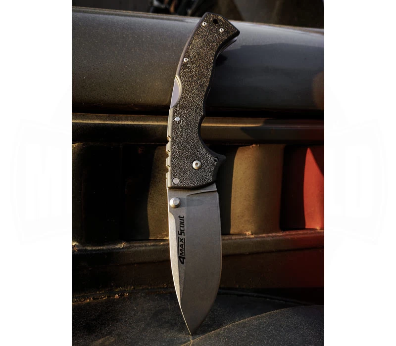 Das ursprüngliche 4-Max entsprach in jedem Aspekt den Vorstellungen von Cold Steel, allerdings waren die Produktionskosten und Produktionsfristen zu lange. Um die hohen Kundennachfragen zu befriedigen, entwarf Cold Steel das 4-Max Scout. Das orginale 4-Max ist mit einer extrabreiten Drop-Point-Klinge ausgestattet. Das Scout hingegen besteht aus 4,8 mm starken AUS 10A-Stahl, der sich durch seine hohe Belastbarkeit, Schlagfestigkeit und Schnitthaltigkeit auszeichnet. Die Form des Griff hat sich in keiner Weise verändert, aber statt G-10 werden hier Griv-Ex-Griffschalen verwendet, die mit einem Edelstahlclip und einem Griv-Ex Backspacer kombiniert werden. Andrew Demkos Trid-Ad-Lock arretiert das Messer zuverlässig und verspricht eine hohe Sicherheit während der Benutzung. Per Daumenpin wird das Messer in offene Position gebracht. Das 4-Max Scout hält Härte- und Belastungstests mit Leichtigkeit stand. Alles in allem ist das 4-Max Scout ein solides und zuverlässiges Taschenmesser, das in Performance und Design dem 4-Max ähnelt, aber mit einem etwas besserem Preis-/Leisungsverhältnis daher kommt.