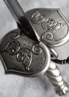Cold Steel Colichemarde SchwertDas Colichemarde Schwert ist eine Variante des Kleinen Schwertes und betrat die Bühne der Schwertgeschichte im späten 16. Jh., als das Rapier aus der Mode kam. Die Klingenform des Colichemarde ist einzigartig, besonders breit und weit am unteren Drittel wird sie nach unten hin leicht schmaler, wo sie in einer gefährlichen Spitze ausläuft. Der Vorteil dieser Klingengestaltung ist, dass man mit dieser eigentlich für den Fechtkampf bestimmten Waffe, auch die schwersten Klingen abwehren kann, ohne dass die Klinge sofort zerbricht. Dennoch ist das Colichemarde hervorragend austariert und leicht genug, um es blitzschnell führen zu können.Aufgrund der Vielseitigkeit sowohl als Angriffs- als auch als Paradewaffe ist Lynn C. Thompson, Gründer und Chef von Cold Steel seit langem ein Verehrer des Colichemarde-Schwertes und bat schließlich Dave Baker um die Gestaltung einer modernen Interpretation dieses besonderen Schwertes.Die Klinge wurde besonders lang und breit konzipiert. Sie verjüngt sich dann plötzlich zu einer sehr scharfen Spitze. Am Heftende bietet ein dekoratives, aber zugleich sehr funktionales Zwei-Schalen-Parier, mit Finger-Schlaufen und Knöchelbogen, ausreichenden Schutz. Der Griff ist komplett mit Draht umwickelt ist schließt mit einem passenden Knauf ab.Im Lieferumfang enthalten ist die abgebildete Lederscheide mit Stahlbeschlägen.Zusätzlich nahm sich Cold Steel die Freiheit, einen passenden Dolch zu kreieren. Er hat eine starke, sehr schön geschliffen und polierte Klinge, ebenfalls eine Doppelparierstange, sowie einen mit Draht umwickelten Griff. Der Colichemarde Dolch hat die Artikelnummer CST-88CLMD.Details:Klingenlänge: ca. 82 cmGesamtlänge: ca. 102 cmGrifflänge: ca. 19 cmKlingenmaterial: 1055er KarbonstahlGewicht: ca. 725 gGrifflänge: ca. 19 cmInklusive Lederscheide mit Stahlbeschlägen