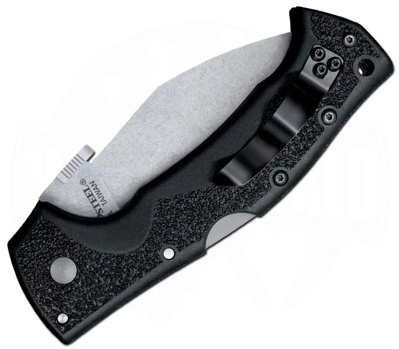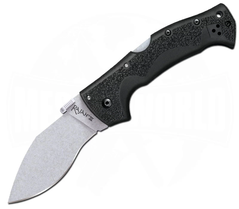 Das Rajah III ist ein robustes Klappmesser, dessen Stil an die klassisch nepalesischen Kukris erinnert. Im Gegensatz zu den rustikalen Kukris wurde hier auf einen taktischen Look gesetzt. Die gebogene Klinge besteht aus dem für Cold-Steel typischen AUS-10A Stahl, der extreme Belastungen aushält, ohne an Schärfe einzubüßen. Mit einer Länge von 8,9 cm hat die Klinge die perfekten Maße, um das Messer immer griffbereit in der Tasche zu haben. Die Daumenscheibe kann auf verschiedene Arten zum Öffnen des Messers verwendet werden. Zum einen kann sie mit dem Daumen bedient werden, was bequem und intuitiv funktioniert, oder direkt beim Ziehen des Messers am Hosentaschensaum verhakt werden, was die Einsatzbereitschaft in Bruchteilen einer Sekunde herstellt. Der nahezu unverwüstliche Tri-Ad-Lock arretiert die Klinge dann zuverlässig. Die Griffbeschalung besteht aus widerstandsfähigem Griv-Ex und bleibt auch bei Nässe durch seine raue Oberfläche angenehm griffig.