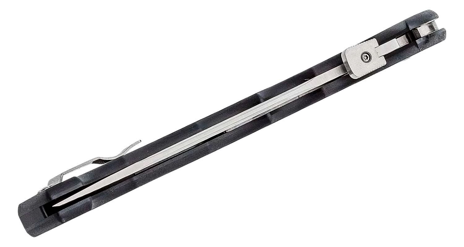 Die gezahnte Klinge ist aus hochwertigem CPM-S35VN-Stahl gefertigt. Sie lässt sich mit einer beidhändig bedienbaren Scheibe an der Oberseite der Klinge öffnen und wird durch eine Tri-Ad-Sperre in der offenen Position gehalten. Der Griff ist aus strapazierfähigem G-10 Material gefertigt. Am Ende des Griffs befindet sich ein Lanyard-Loch. Das Messer ist mit einem Clip zum Tragen in einer Tasche ausgestattet.
