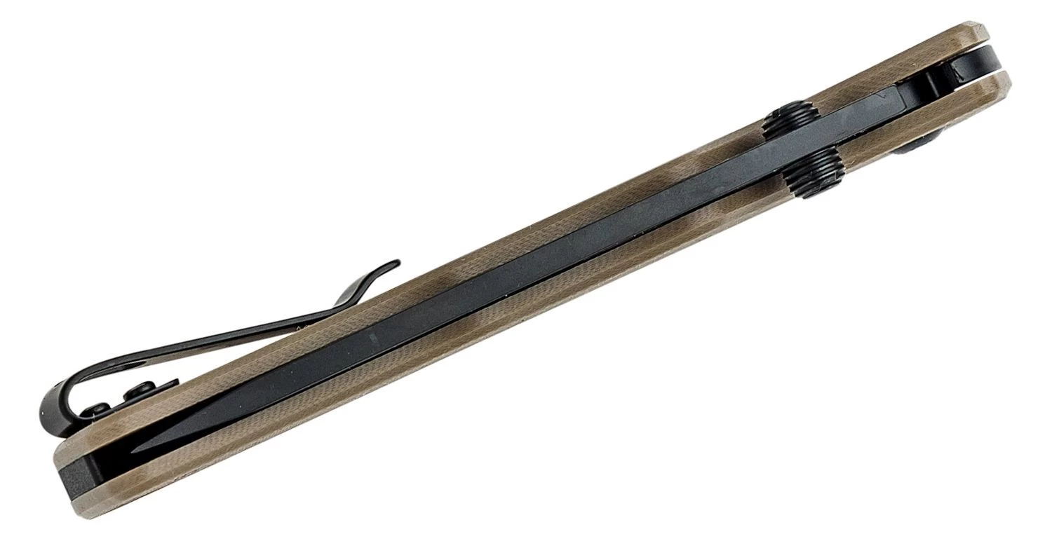Die Klinge ist aus robustem japanischem AUS 10A-Stahl mit schwarzer DLC-Beschichtung gefertigt. Sie lässt sich mit einem Stift an der Klinge öffnen und wird in der offenen Position von einem Tri-Ad-Lock gehalten. Der flache Griff ist aus strapazierfähigem G-10 Material gefertigt. Am Ende des Griffs befindet sich ein Lanyard-Loch. Das Messer ist mit einem Clip zum Tragen in einer Tasche ausgestattet.